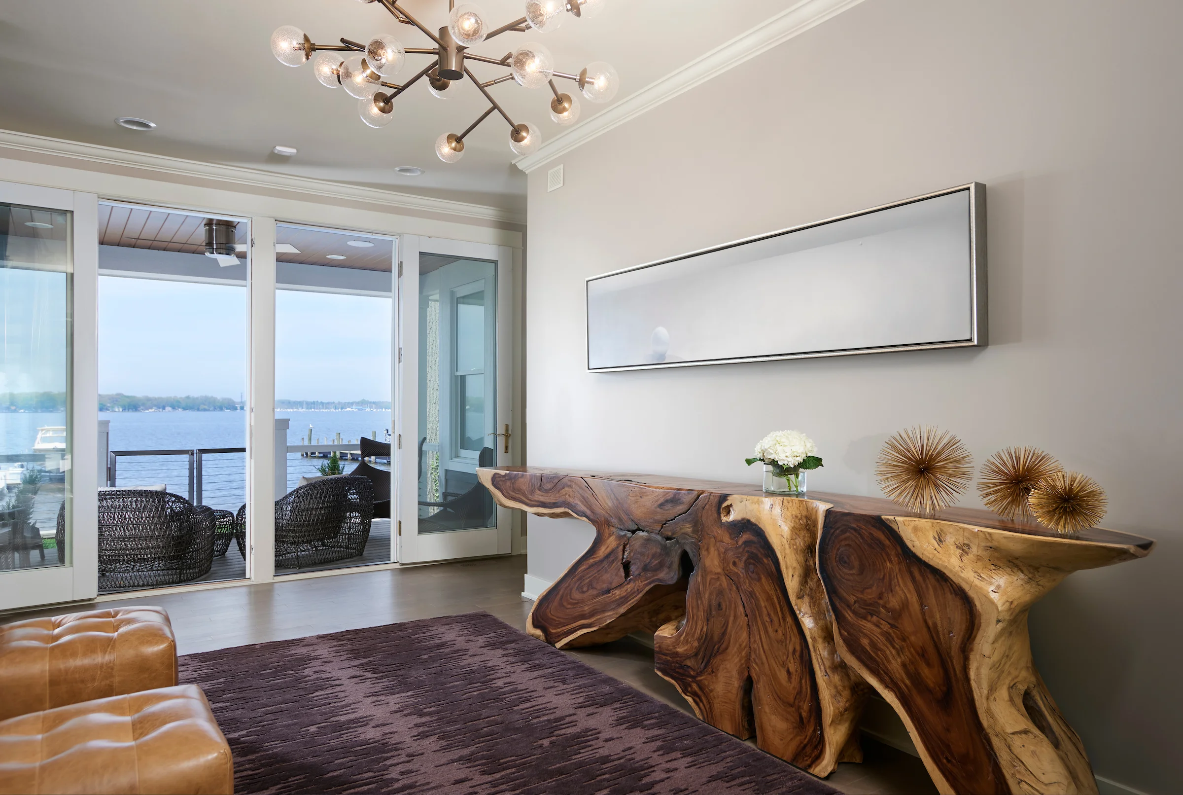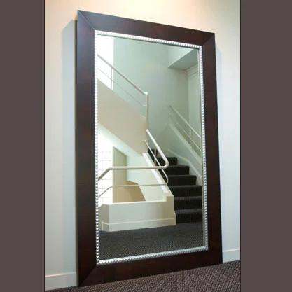 A large lacewood and silver leaf custom made mirror reflects the light and architectural elements of this space. - See entire project