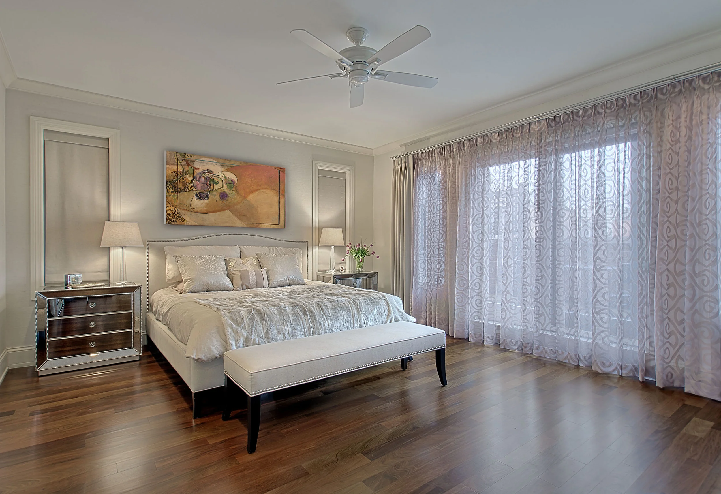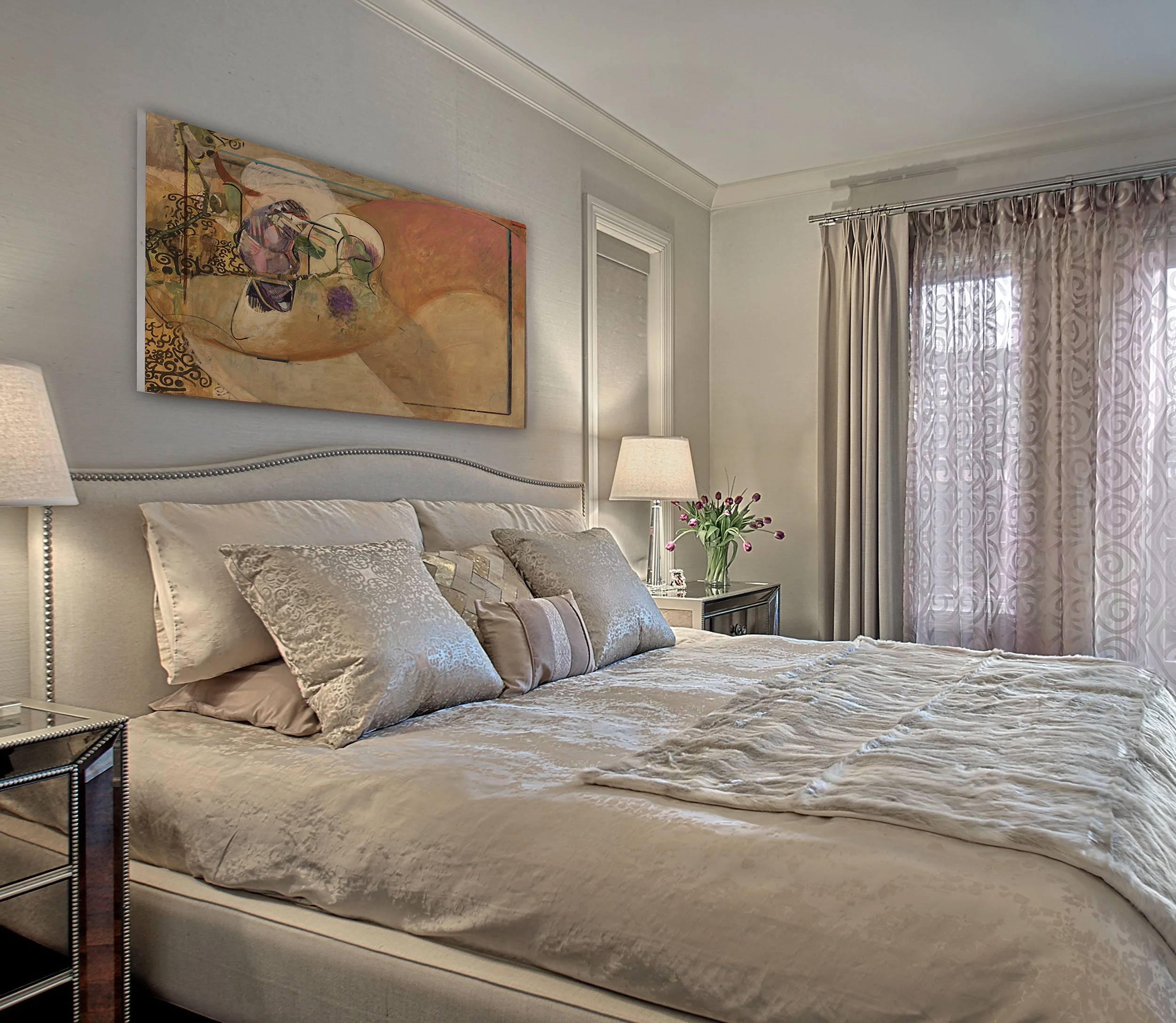 A master bedroom with custom made headboard, bedcover and pillows, reusing the clients existing bedside tables and lamps. - See entire project