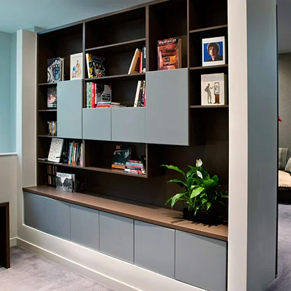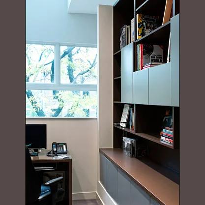Past projects incorporating custom woodworking have included kitchen and bathroom design, home office desks and storage, corporate office reception desks and cabinetry, restaurant design, media storage, bookshelves and fireplace surrounds.